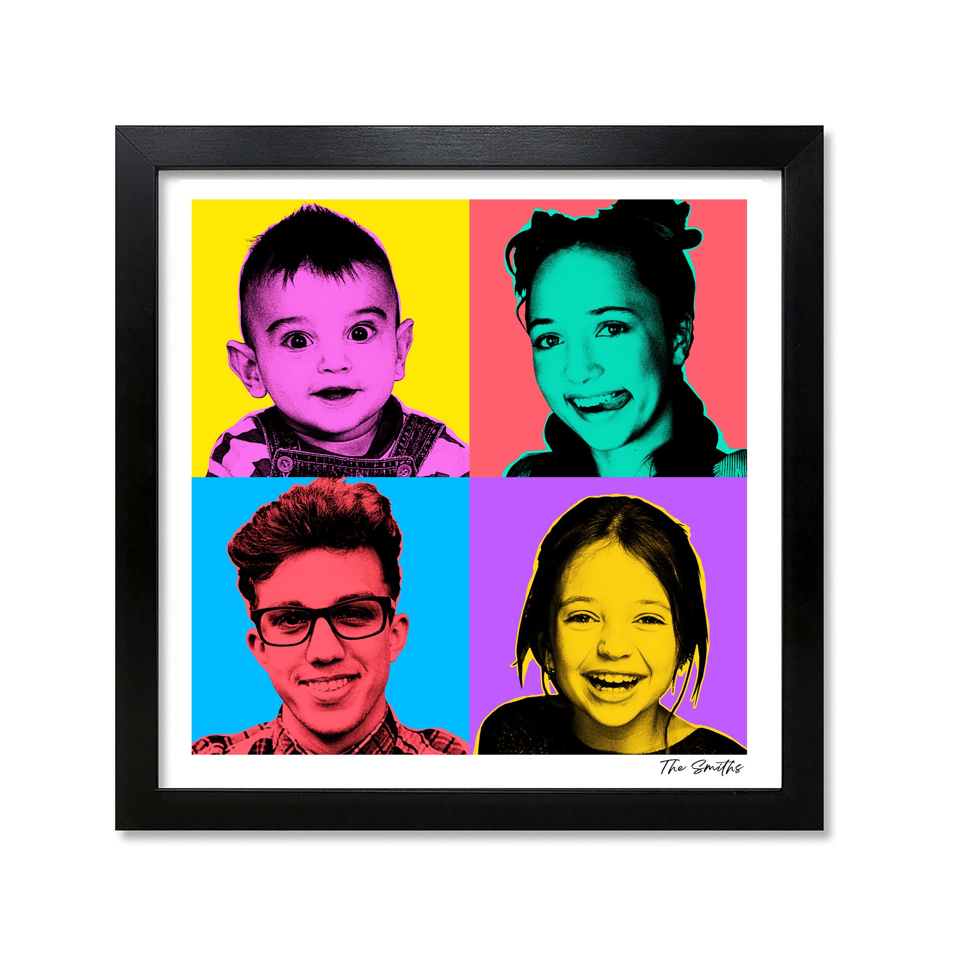 This colourful Pop Art portrait of your family will brighten up any room. You can add up to four photos and fill it up or leave squares blank for a bit of colour, you can even add a special message or saying if you like.