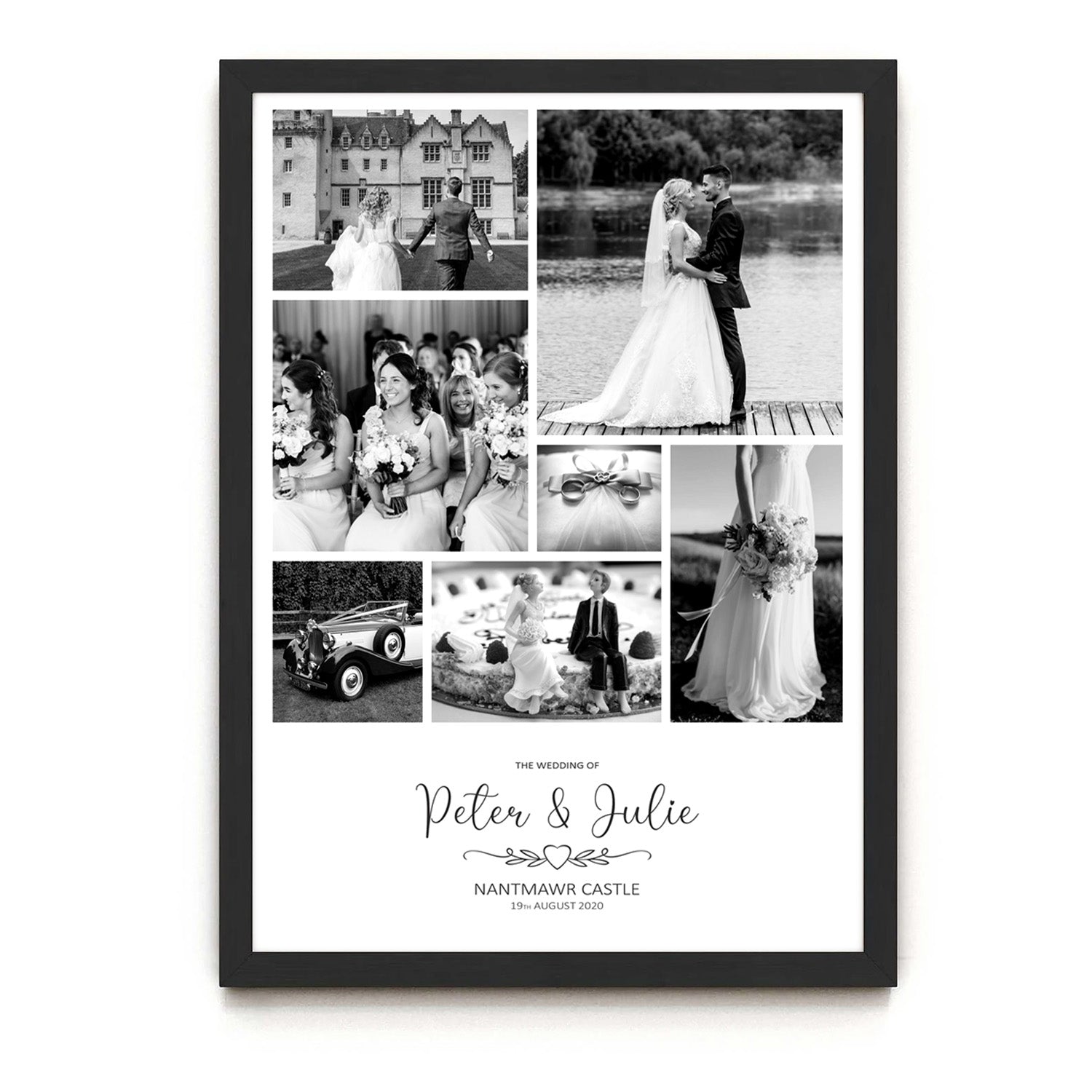 Photos should be displayed and enjoyed! Our Wedding collages make a perfect gift for the happy couple, with several great styles to choose from. Simply pick your size and frame type and upload your photos and text requirements..... we'll take care of the rest. If you would like your photos converting to black and white please let us know when ordering.